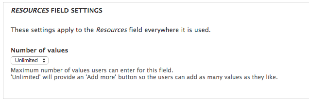 - At the bottom of the settings page for the new field (in my case at admin/structure/types/manage/article/fields/field_resources ) configure the following settings.